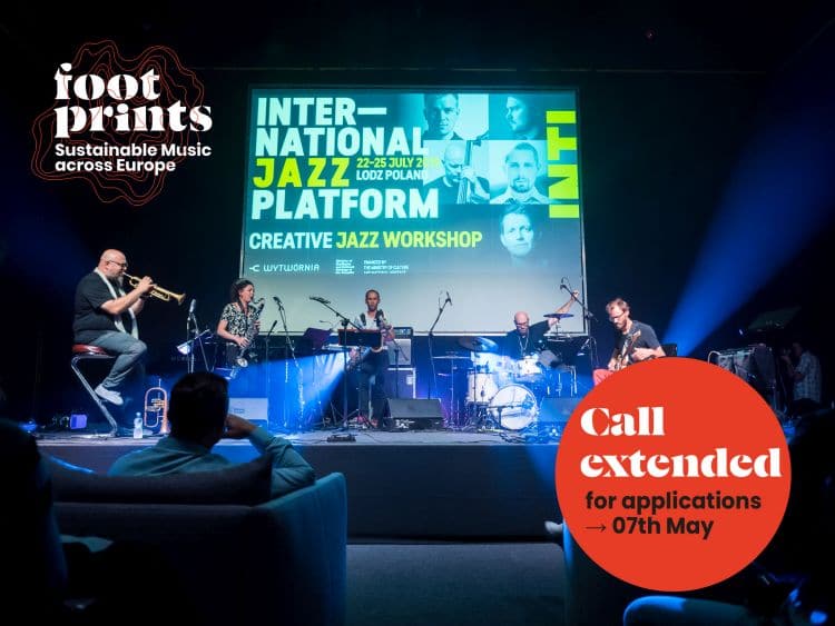 Ihr wollt ein europaweites Netzwerk aufbauen? Ökologische Tourneen abhalten? Musikalisch und sozial weiterentwickeln? Das neue Programm von FOOTPRINTS EUROPE sucht  50 Musikerinnen und Musiker für den Sommerworkshop der Intl. Jazz Platform in Lodz/ Polen. 6 davon (mit den zugehörigen Bands) werden für die eine europaweite (+ finanzierte) Tour ausgewählt. Die Bewerbungsfrist wurde bis 7. Mai verlängert.
