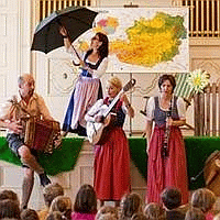 Was hat der italienische Mozzarella mit der Tarantella zu tun? Und das Kärntnerlied mit einem slowenischen See? Mit einem Blick „Übern Zaun“ schlagen die Salzburger Musiker von Radau & Co augenzwinkernd volksmusikalische Brücken zwischen Österreich und seinen Nachbarländern. Über 20 Instrumente sind im Einsatz, das ungarische Cymbal genauso wie slowakische Hirtenflöten, ein ungarischer Csardas wird getanzt, ein Wienerlied wird gesungen. Sogar echte Schuhplattler (fünf und sieben Jahre alt) sind dabei. Für die Erwachsenen gibt es dazwischen, spielerisch verpackt, interessante Informationen über den kulturellen Bezug, die Ähnlichkeiten und Unterschiede der Stücke, Tänze und Lieder.
