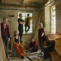 Die sechsköpfige Band GOT'YA in einem verlassenen Gebäude. Teilweise stehen die Mitglieder, teilweise sitzen sie.