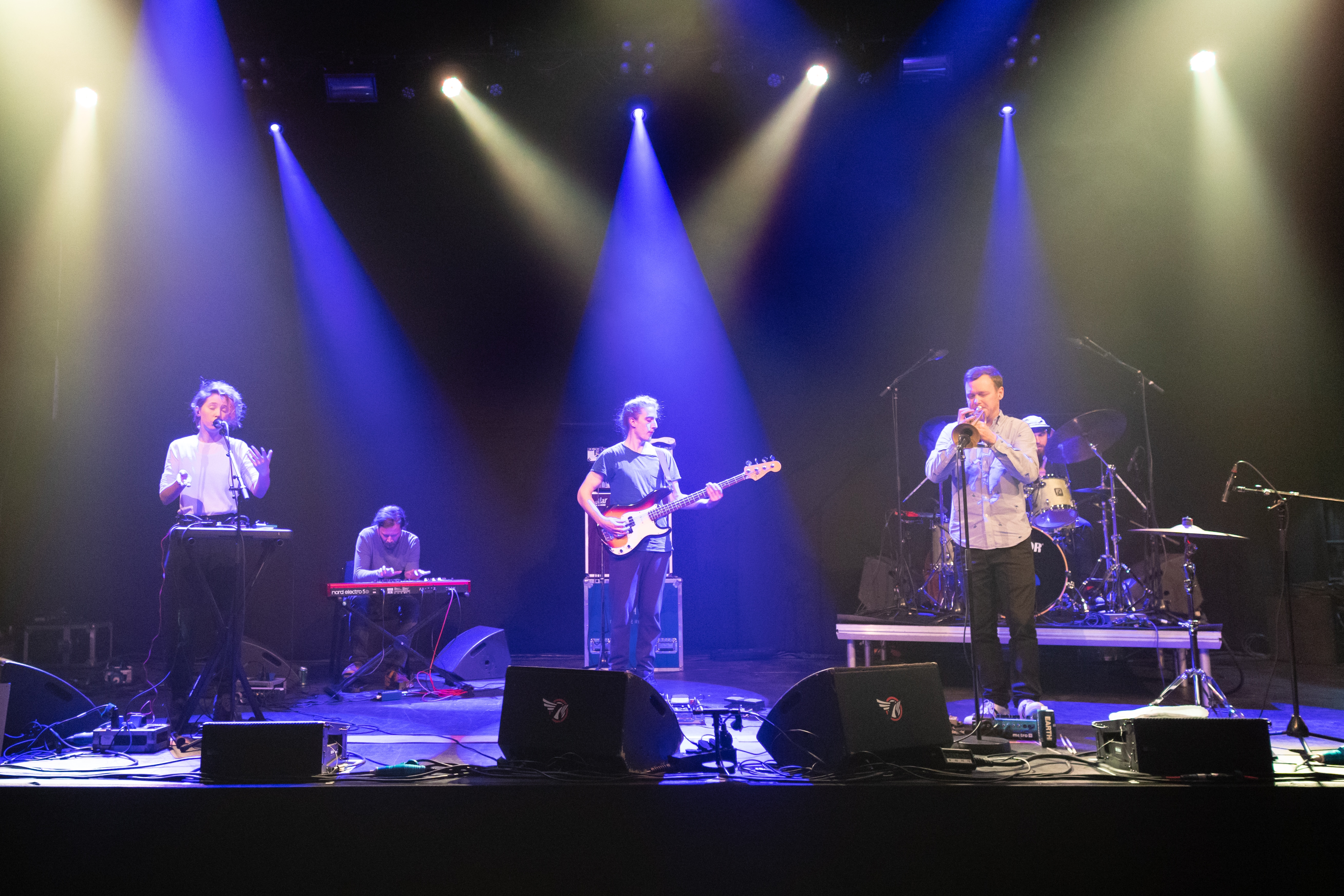 Im Groninger Forum, einer Location, die sonst als Kino genutzt wird, hatten 5K HD eine riesige Bühne zur Verfügung. Das hochkarätig besetzte Ensemble, bestehend aus den renommierten Musikern der österreichischen Band Kompost 3, Martin Eberle (Bläser), Benny Omerzell (Keys), Manu Mayr (Bass) und Lukas König (Schlagzeug) sowie der Sängerin Mira Lu Kovacs von Schmieds Puls lieferte in dem gut gefüllten Saal, in dem sich einige internationale Festival-Booker eingefunden hatten, einen grandiosen Auftritt.